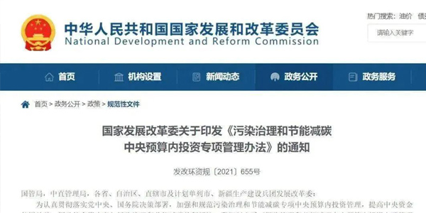 从国家发改委网站获悉,近日,国家发改委印发《污染治理和节能减碳中央预算内投资专项管理办法》(以下简称《办法》)的通知。
